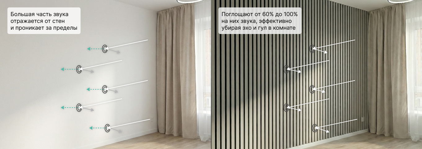 - Акустическая обработка улучшает звук ВНУТРИ комнаты. Она борется с эхом и гулом.