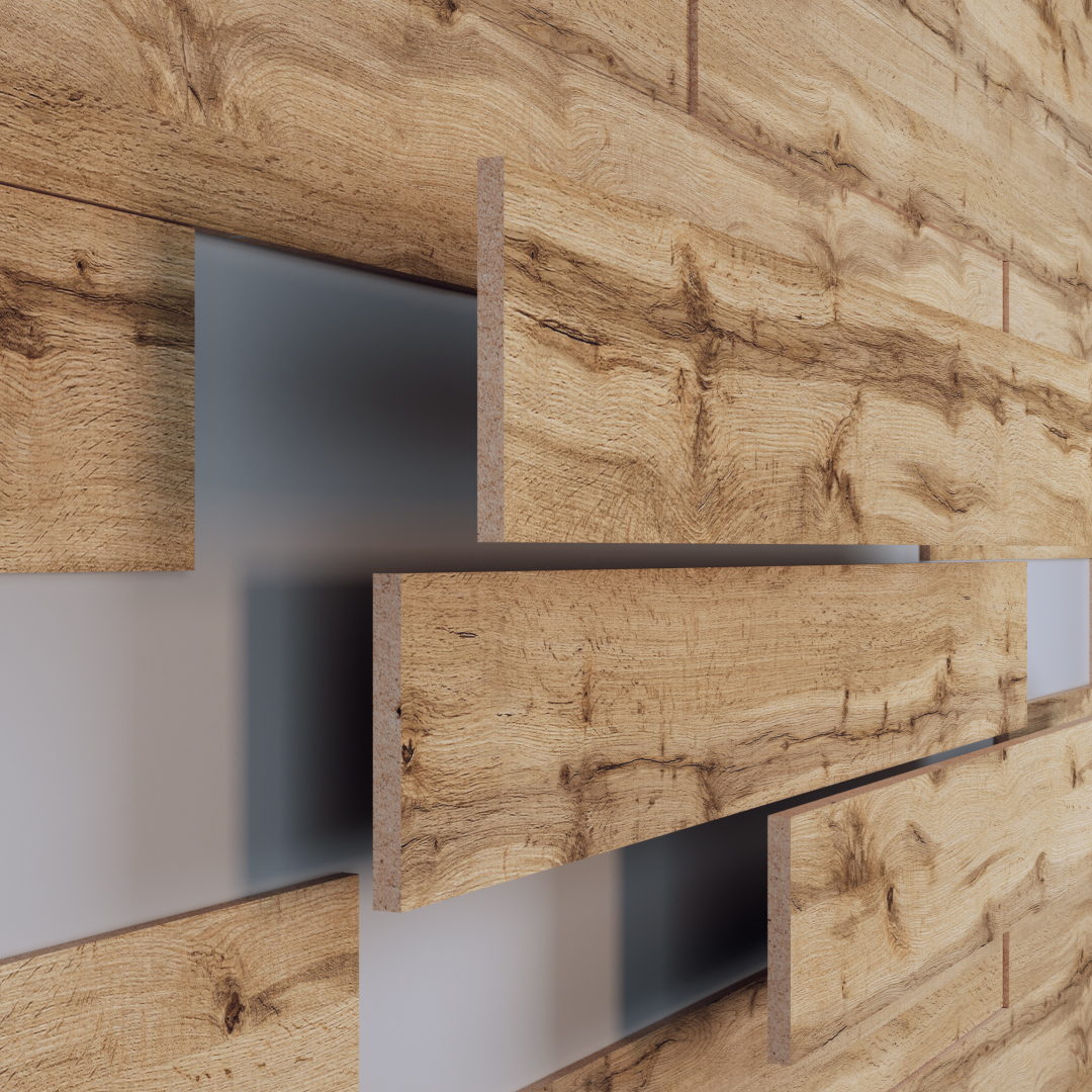 3D панели изготовлены из МДФ премиум класса средней плотности. Глубина и рельефность обеспечивается посредством уникальной финиш-пленки которая максимально точно передает текстуру натурального дерева.