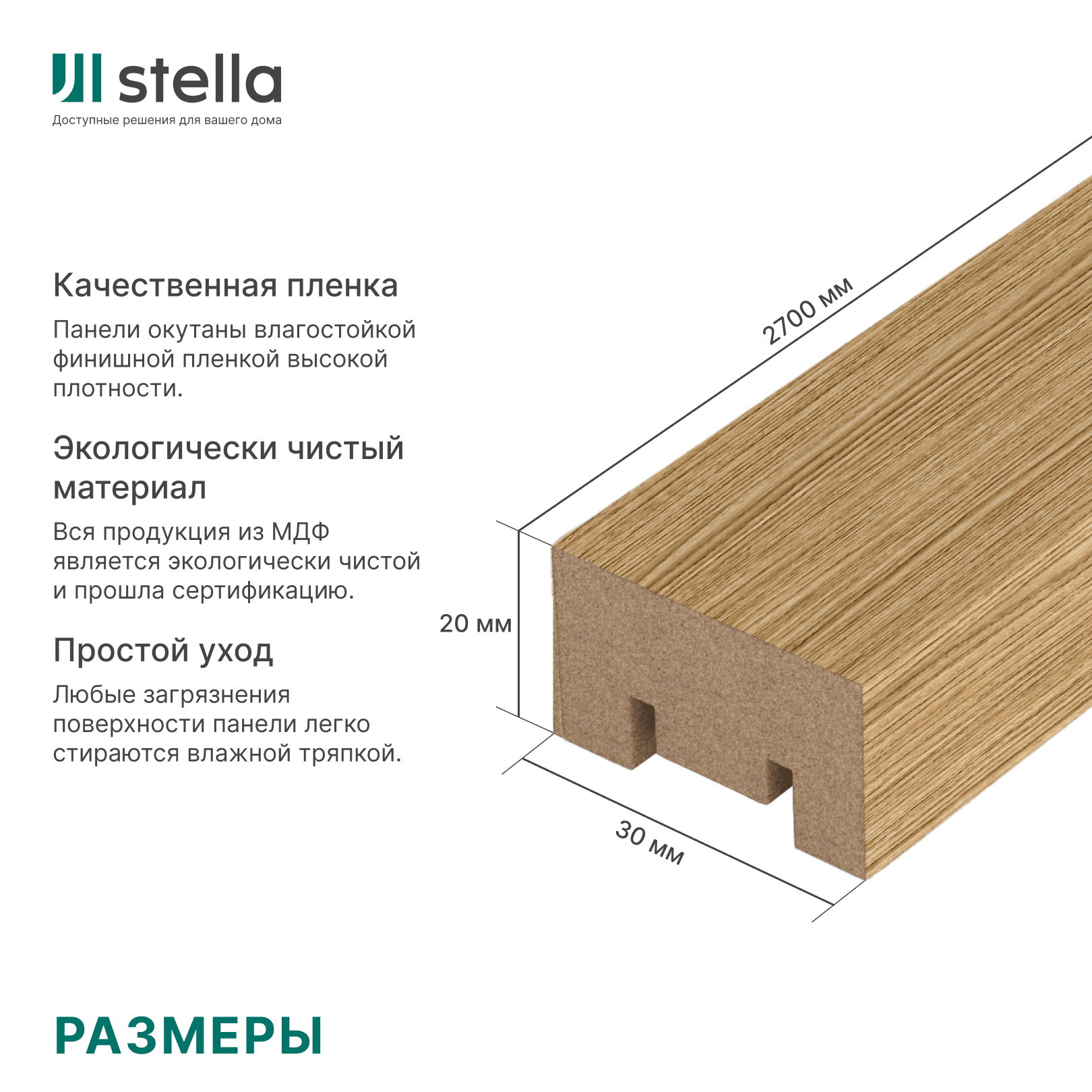 Интерьерная рейка МДФ Stella Милана Standart в цвете Дуб Сальвадор 20×30×2700 мм (упаковка 8 шт.) — это изящное и современное решение для декоративной отделки стен, потолков и создания стильных акцентных элементов интерьера.
