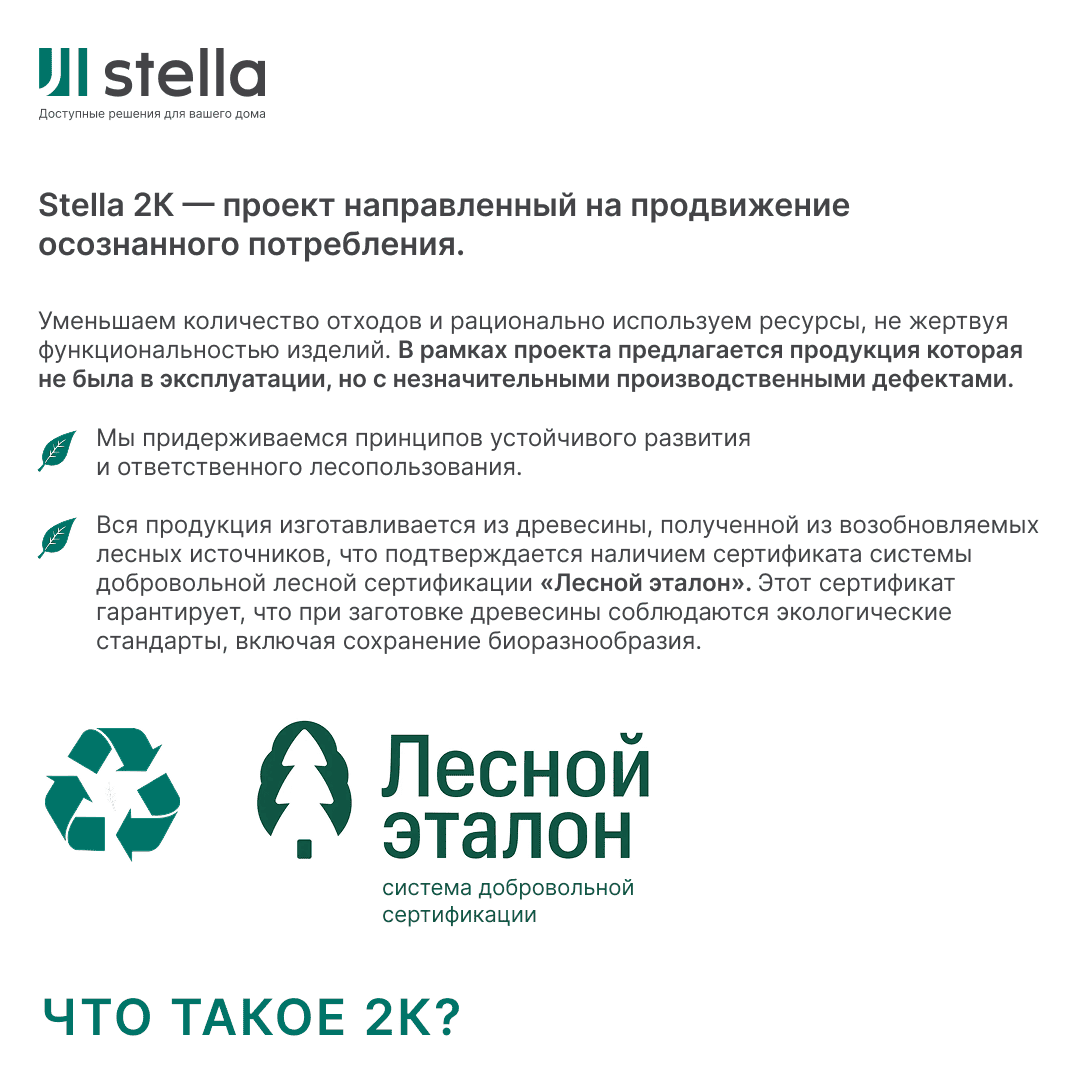 • Выбирая продукцию Stella 2К, вы не только экономите, но и поддерживаете осознанное потребление и сохранение природы.