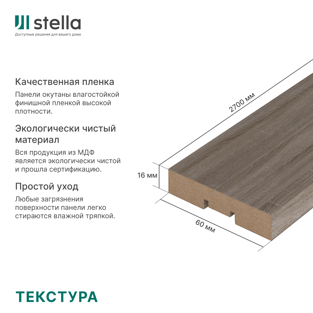 Рейки изготовлены из экологически чистых материалов премиум класса. Неповторимая древесная текстура создаётся благодаря уникальной финиш-пленке, которая обеспечивает рейкам эстетичный внешний вид и защиту от износа в процессе эксплуатации. Идеально сочетаются со стеновыми панелями коллекции Standard.